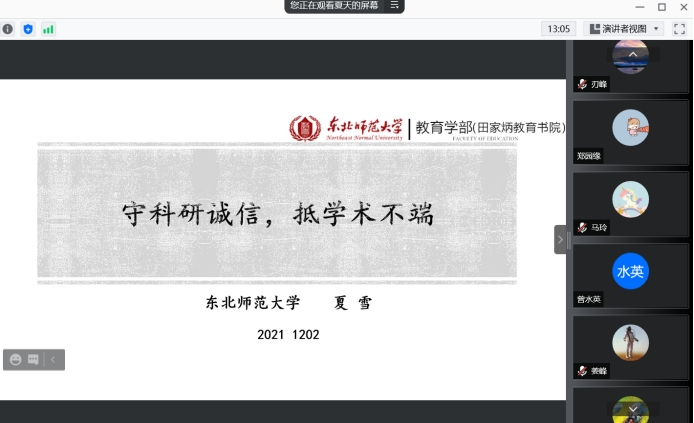 之后,开展“守科研诚信,抵学术不端”的学术报告,主讲人是东北师范大学教育学部教育管理学院博士生导师夏雪老师,成人直播