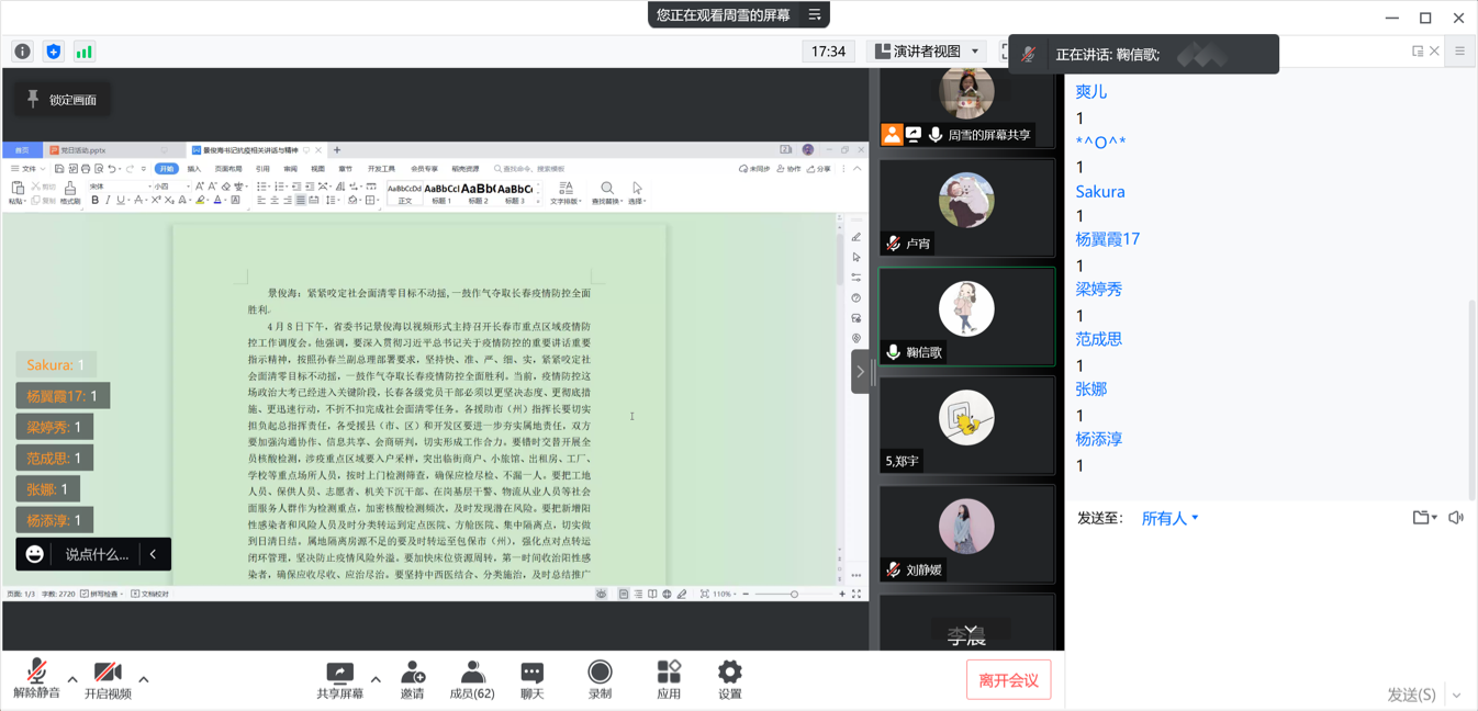 研究生第一党支部书记鞠信歌老师询问了支部党员们身处不同地区的防疫现状,党员们踊跃发言:聂辛哲同学分享了自己在抗疫重地吉林市九台区积极配合政府工作采用网格方式配送物资的防疫事迹;周雪同学代表在校同学们阐述了封校后在党中央的正确领导以及吉林省委的正确部署下,校领导、老师以及志愿者们的辛苦付出,学校防