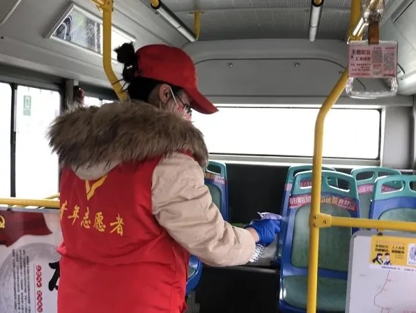 作为3路公交车上的志愿者小张主要负责给车上乘客测量体温、登记信息,并且维护秩序。