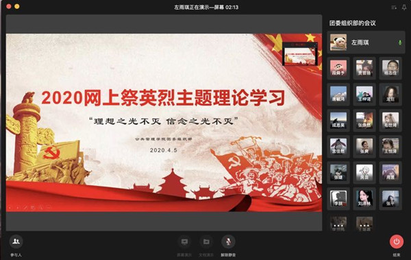 学院网讯(通讯员 张宇航)为深入贯彻学习习近平总书记关于防控新冠肺炎疫情及英烈褒扬的重要论述和指示精神,教育引导青年学子深刻铭记革命先烈光荣事迹,继承和发扬革命先烈优秀传统。2020年4月4日-4月5日,我院“求是”理论社团通过网络平台开展清明网上祭英烈“理想之光不灭,信念之光不灭”主题理论学习系列活动。学院团委副书记张宇航同学主持,全体成员参加学习。