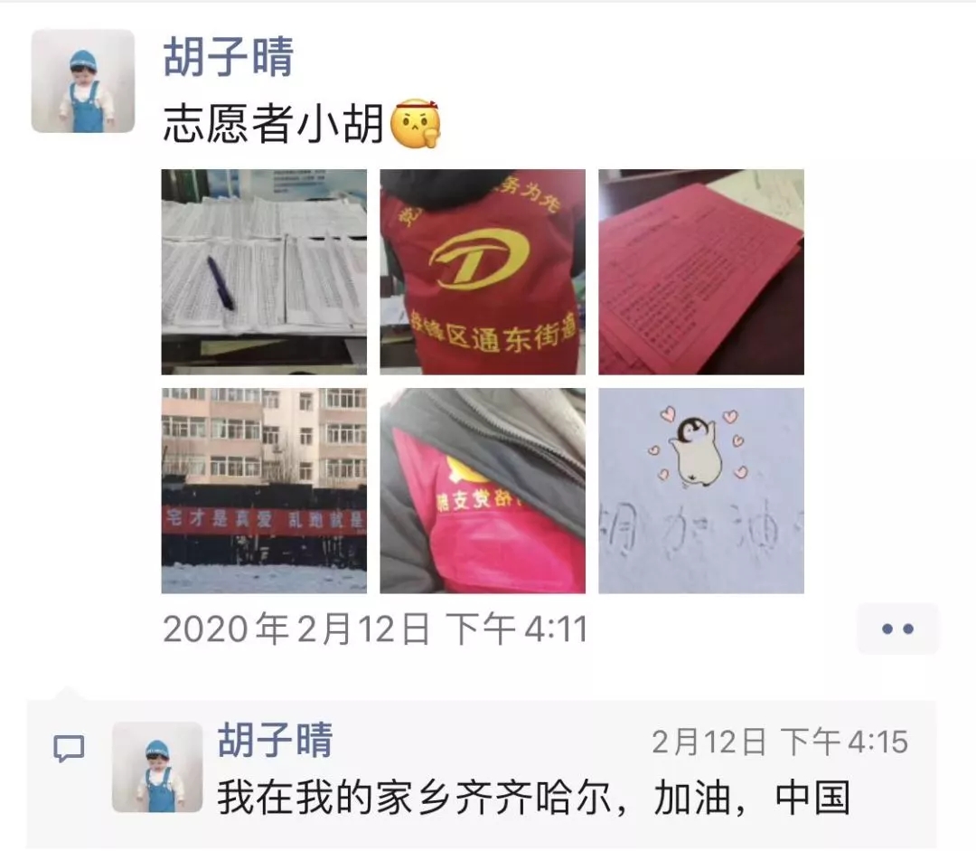 胡子晴到了所在小区的社区委员会后,在书记的帮助下,简单记录信息,了解情况后,便积极投入到疫情防控志愿者服务中。深入社区、街道参与体温测量排查、便民服务、秩序维护,各种“抗疫”宣传的工作中,为打赢疫情防控硬仗奉献青春力量。疫情期间,她一直为进出居民测量体温,询问外来人员情况并对其进行登记。