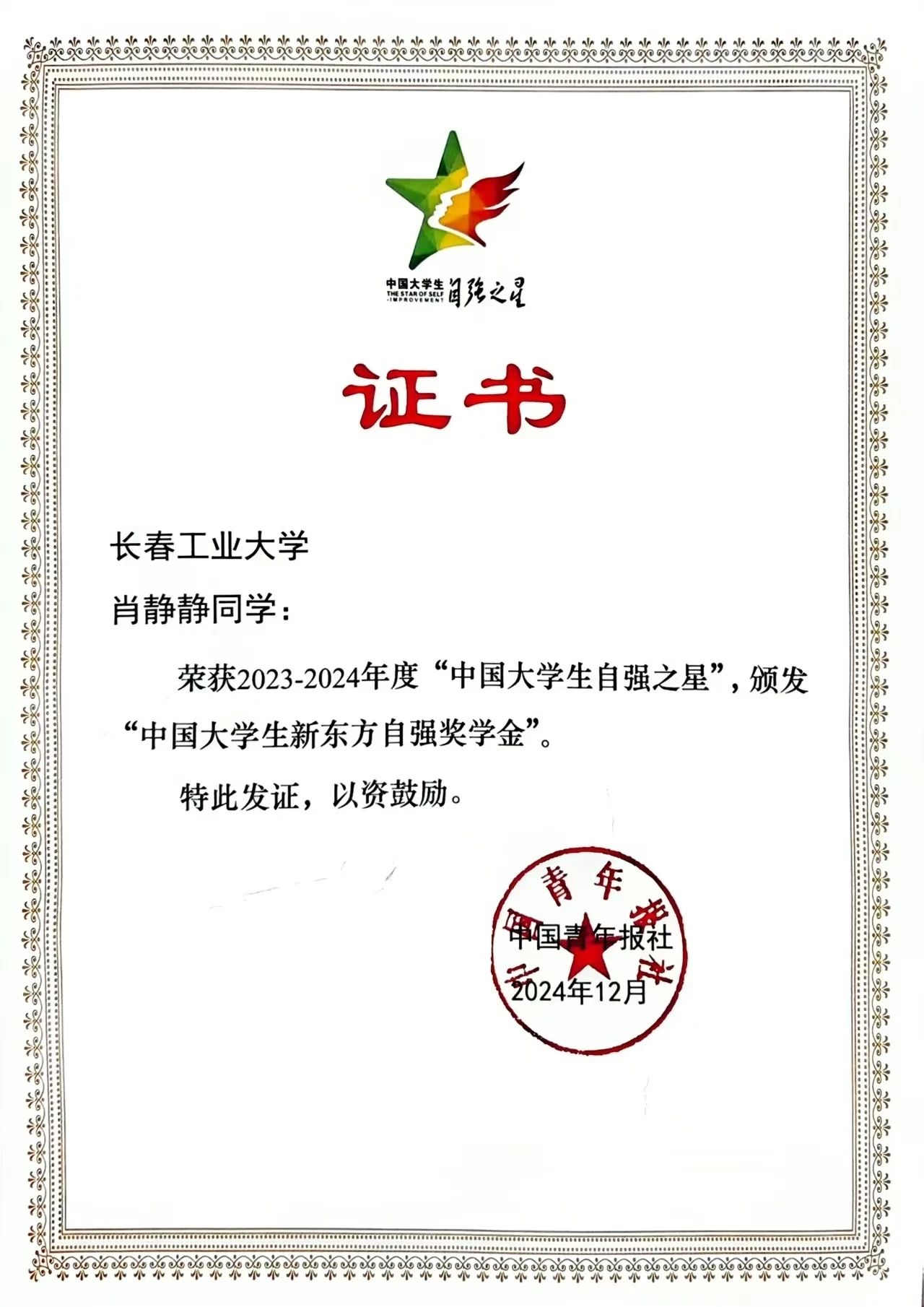 喜报!我院肖静静同学获得2023-2024年度“中国大学生自强之星”荣誉称号