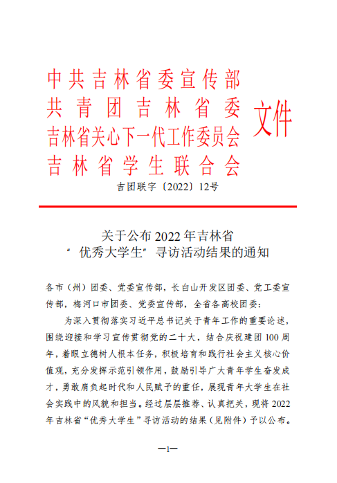 关于公布 2022 年吉林省“优秀大学生”