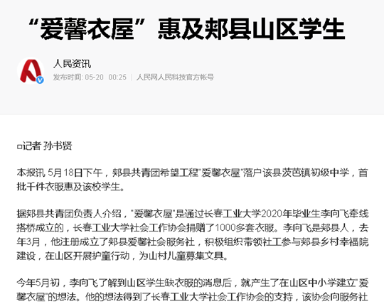第七届社工文化节举办期间,我校2020届社工专硕李向飞在河南郏县创办专业社工机构——“爱馨社工服务社”,结合地方实际,向社会发出为郏县留守困境青少年捐献衣物活动的倡议。
