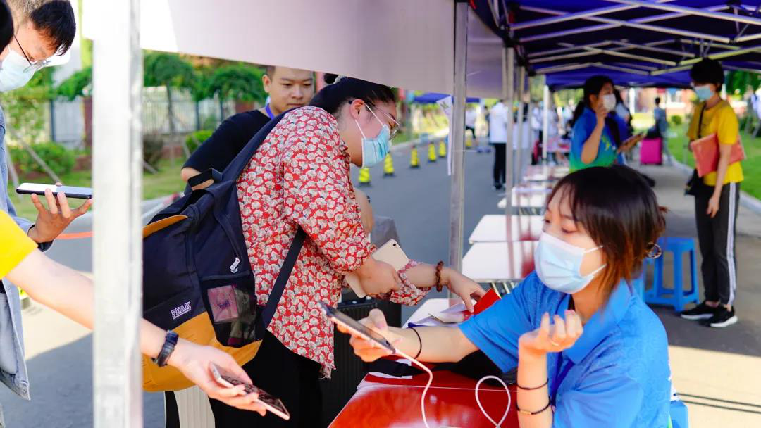 在疫情常态化工作的背景下,为了保障学生们的安全,我院积极配合学校防疫工作的安排,坚决遵守防疫工作要求。学院团委提前挑选了八十九名志愿者同学,并对他们进行了专业的志愿服务培训。新生报道在校门口进行消毒、核验身份、核验健康码及行程码,再由志愿者引导至各年级报道处完成报道手续。