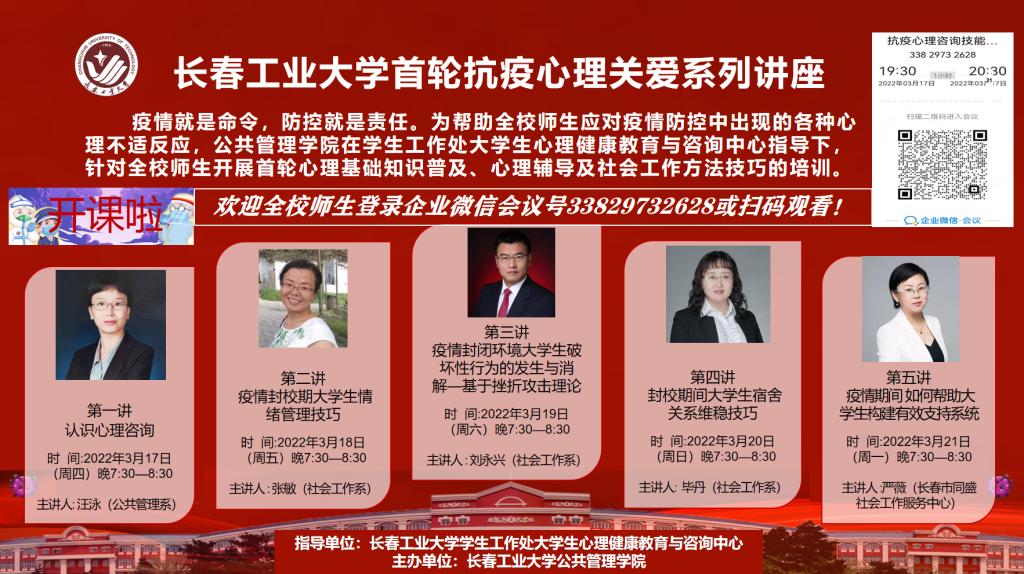 举行首轮抗疫心理关爱系列讲座在线开班仪式。全校400余名师生在线参与此次活动,成人直播
