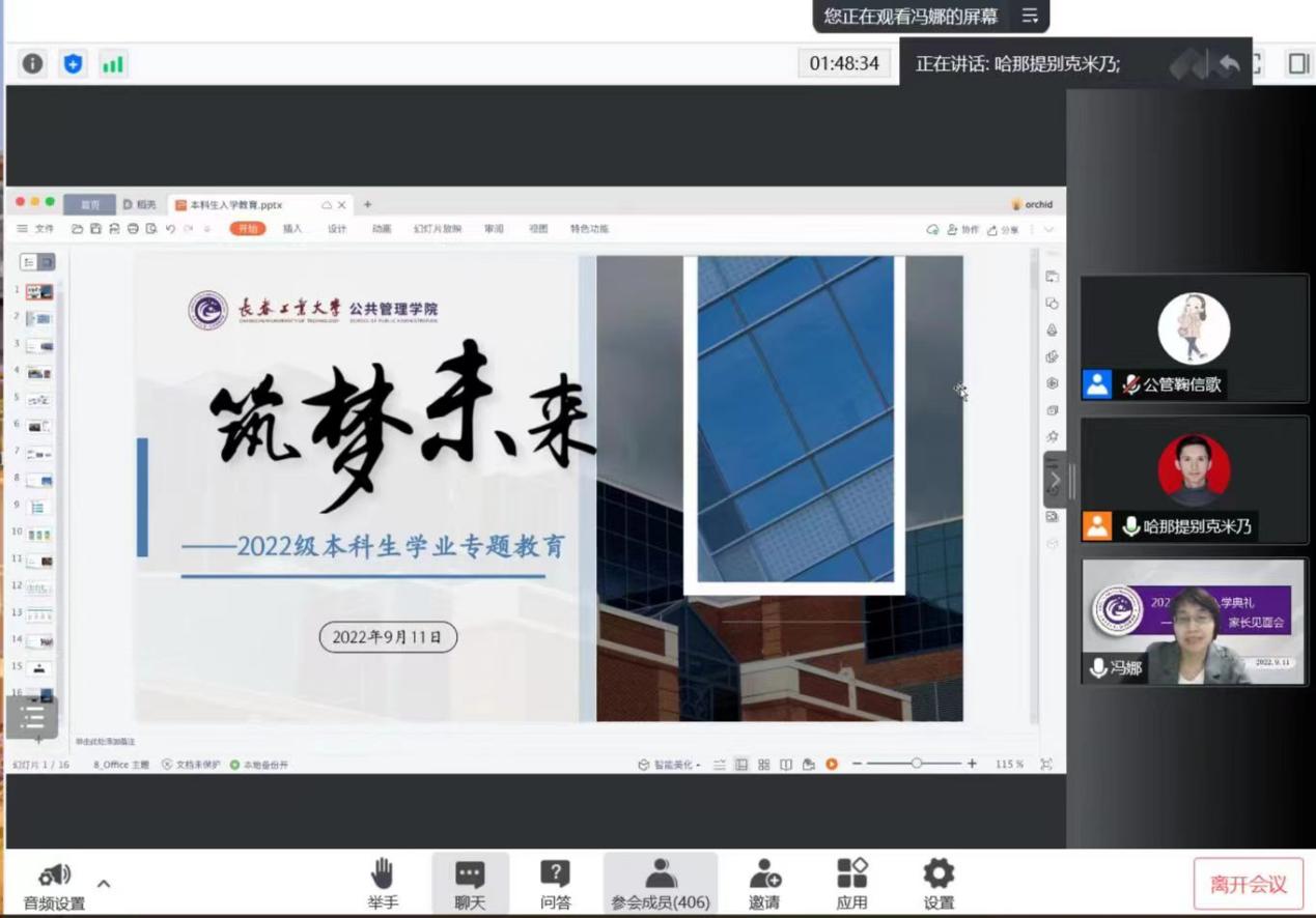 通过腾讯会仪举行2022级新生入学典礼暨学生家长见面会。学院班子成员、各系书记主任、两办主任、教学秘书、新生辅导员以及全体本科、研究生新生及其家长参与加此次会议。会议由团委书记、学生工作办公室主任陈磊主持。