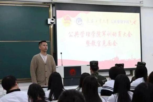 于5月14日在艺术楼阶梯教室召开2022级学生军训动员大会暨教官见面会。2022级辅导员哈那提别克·米乃出席活动并主持,2022级全体学生与承训教官王帅、王梓、吴晓烨见面。