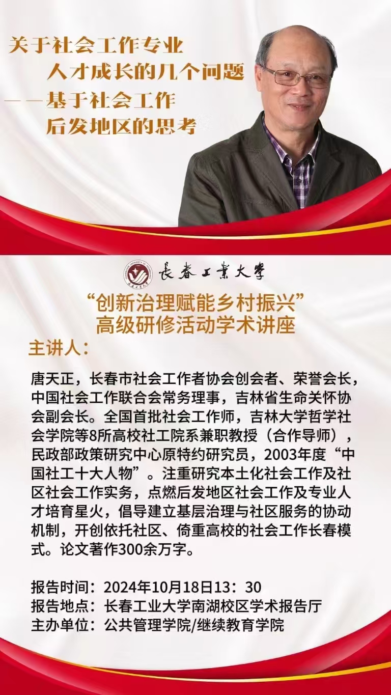 唐天正,长春市社会工作者协会创会者、荣誉会长,中国社会工作联合会常务理事,吉林省生命关怀协会副会长。全国首批社会工作师,吉林大学哲学社会学院等8所高校社工院系兼职教授(合作导师),民政部政策研究中心原特约研究员,2003年度“中国社工十大人物”。注重研究本土化社会工作及社区社会工作实务,点燃后发地区社会工作及专业人才培育星火,倡导建立基层治理与社区服务的协动机制,开创依托社区、倚重高校的社会工作长春模式。论文著作300余万字。