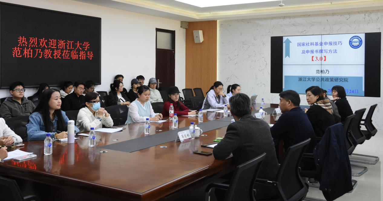 在401会议室召开了2026年国家社科基金项目申报专家辅导会,邀请浙江大学范柏乃教授来院进行指导。学院领导班子、科研骨干教师、青年教师等参加了本次活动。